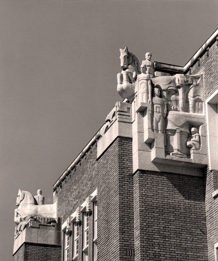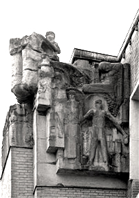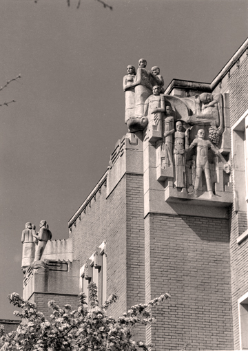 Op het andere gebouw, de voormalige huisvesting van de 2e Openbare Handelsschool, vinden we het beeldhouwwerk 'Menselijke energie'. Onderaan staat de energie met gespreide benen en armen afgebeeld, met boven hem 'De Vruchtbaarheid', een geknielde half liggende vrouw met een druiventros in haar hand. Verder naar boven staan drie figuren, de landbouw met landbouwgewassen, de industrie met gereedschappen, en de handel met goederen als koopwaar. Op het hoogste punt van de beeldhouwwerken staat een groep mensen, een vrouw en twee mannen die elkaar met hun armen omvatten. Ze kijken als vanaf een schip uit naar de verte. Vanuit de vruchtbaarheid van de aarde en verschillende vormen van menselijk handelen zijn zij de mensen, de handelslieden, die met vooruitziende blik naar de toekomst kijken.